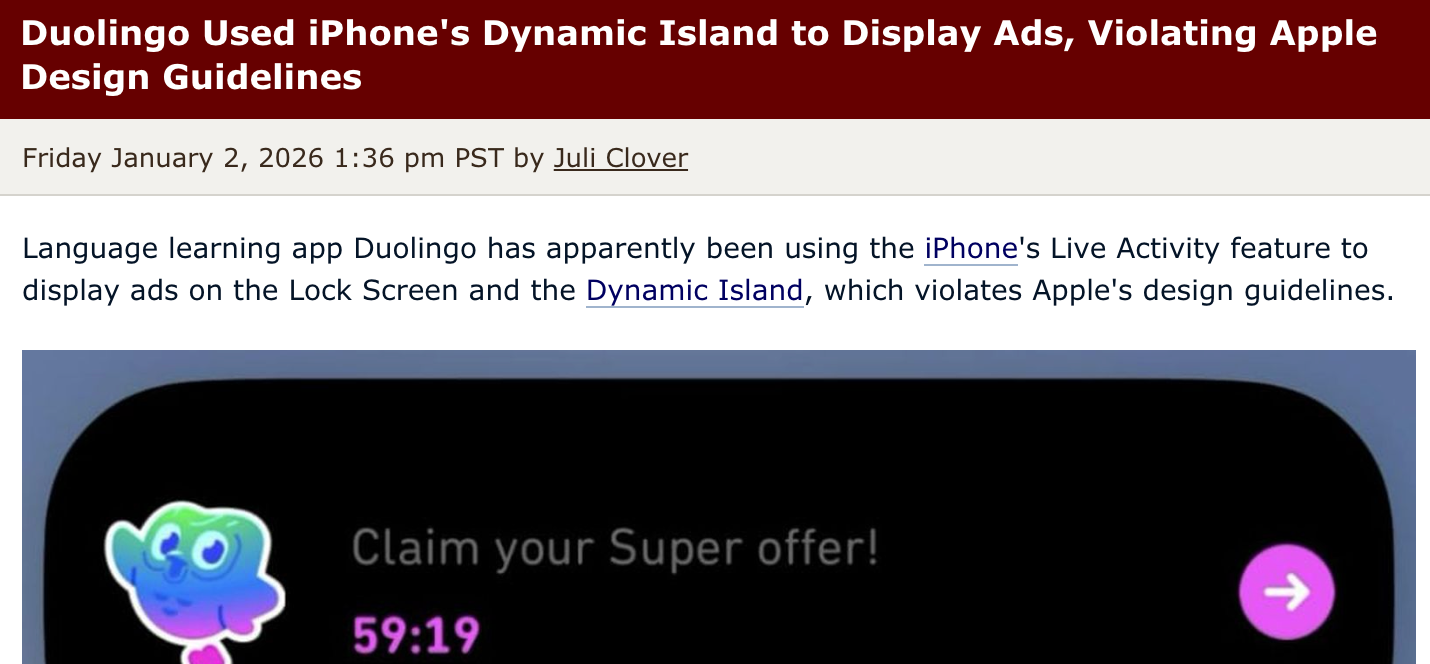 【环球网科技综合报道】1月3日消息,据科技媒体MacRumors报道,语言学习应用“多邻国”(Duolingo)近日被部分苹果iPhone用户发现利用灵动岛展示广告,此举涉嫌违反苹果官方设计准则,引发关注。