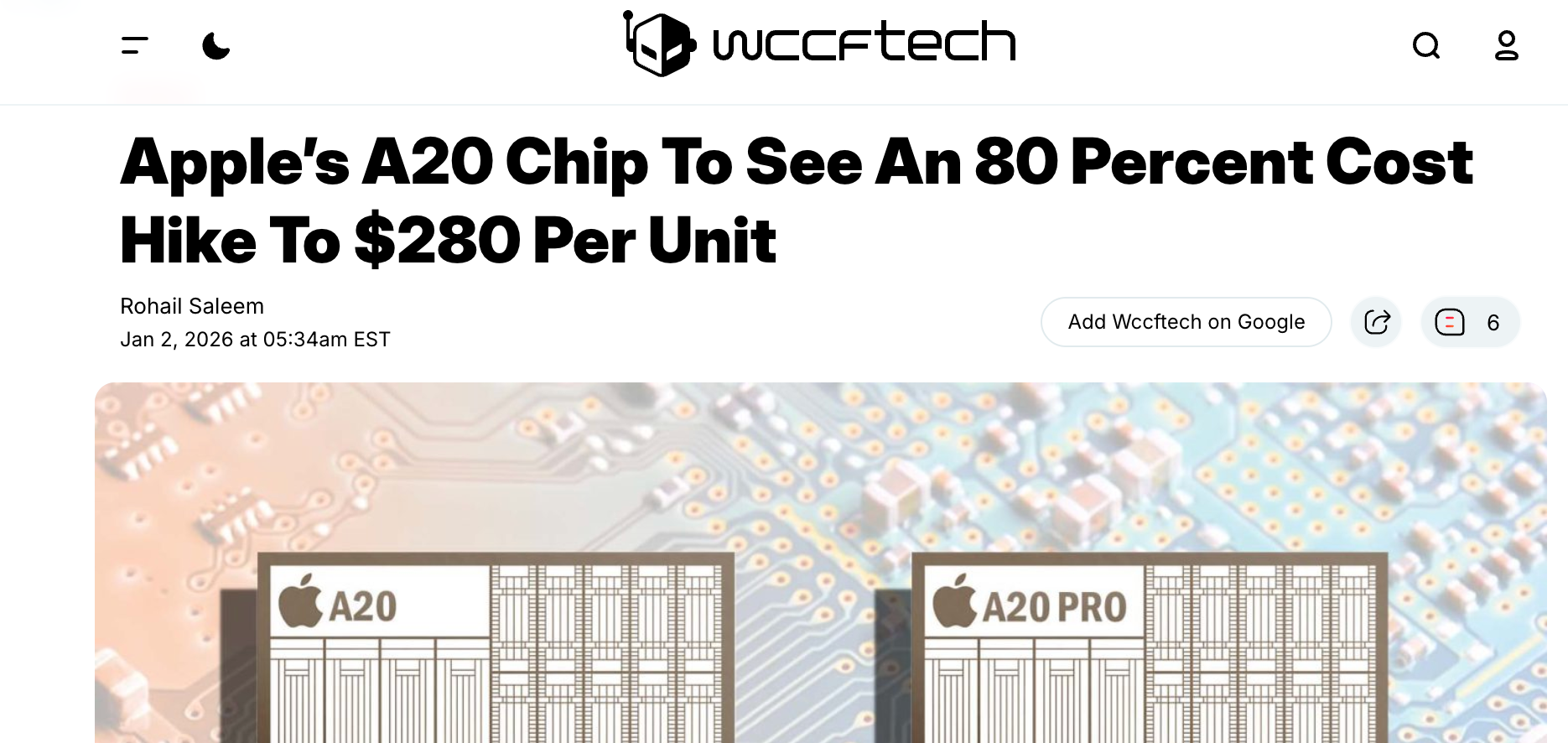 据可靠消息,即将推出的苹果A20芯片预计每颗成本高达280美元,与目前苹果iPhone 17系列所搭载的A19芯片相比,价格同比上涨了约80%。