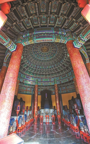 在某些建筑纵深方向的中轴线上,有时会设立一根从地面直通屋脊的柱子,这便是中柱。它犹如建筑的脊柱,将进深方向的空间明确划分为前后两部分。中柱常见于宫殿的门殿、寺庙的山门或一些民居的厅堂之中,具有强烈的对称与导向作用。作为一座无梁殿,天坛祈年殿共有三圈柱子共28根,中央巍然矗立着四根巨大的“龙井柱”(也叫里金柱),它们象征四季,是整个环形建筑结构的绝对中心;中层十二根大柱(也叫外金柱)比龙井柱略细,象征一年的十二个月;外层十二根柱子叫檐柱,象征一天的十二个时辰。