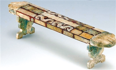 下面我们就来看看徐州狮子山楚王陵一个陪葬墓出土的玉枕——食官监玉枕。这个玉枕整体像一个长条板凳,表面镶有35块玉片,两端装饰有兽头,枕腿像一个“工”字,显得强劲有力。枕板内为一长方形木枕芯,上面镶饰有35片雕琢精美的龙形、长方形、“亚”字形等玉片,枕板两端为兽头状玉饰。