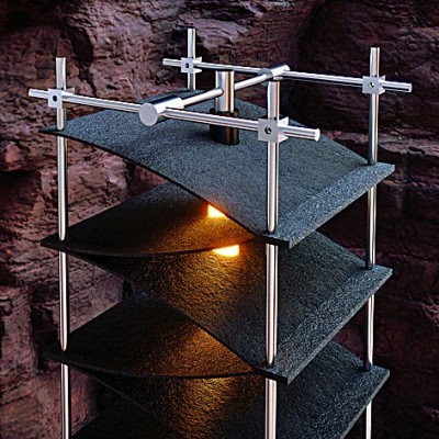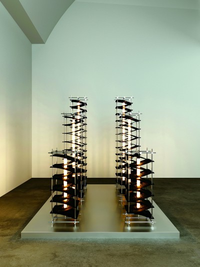 制作时,设计师将这些黑色瓦片首尾相接,层层叠加,使之侧面呈现出连续不断的“之”字形,再以金属框架进行固定。管状LED光源从每一层瓦片的中心贯通,并被其分隔为一段段光柱。在组装构件时,设计师的心中多了一丝忐忑,担心黑色较低的反光率会影响落地灯的照明效果,而当灯光亮起,这一疑虑便烟消云散了。黑色瓦片并没有削弱灯光,反而将光晕切割为一层层弧线,显隐之间呈现出强烈的形式美感。若以不同角度摆放落地灯,还可实现灯光亮度与环境氛围的调节。