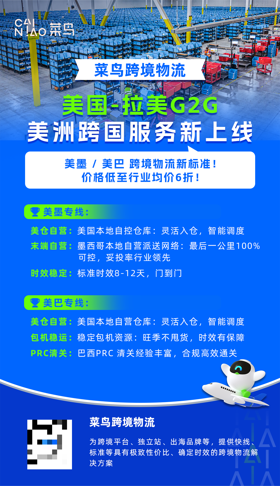 {jz:field.toptypename/}菜鸟美-墨G2G跨境专线以“轻成本、高确定性”为核心产品定位,平均价格比行业均价低40%,其中0-2.5公斤区间价格在市场中具有领先优势,相当于“一杯咖啡钱”就能完成美国至墨西哥的跨境配送。同时,该服务依托菜鸟在美国和墨西哥的本地自营网络,利用高效空运最快8日可达墨西哥,以高稳定性为跨境卖家提供更加可控的全链路物流解决方案。