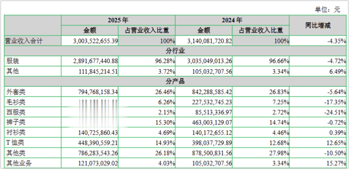 与之造成明显对比的是,公司中枢服装业务捏续承压,2025年服装业务总营收28.92亿元,同比下滑4.72%,主打品类外衣类营收7.95亿元,开云同比下滑5.64%,仅衬衫、T恤两类小众居品兑现营收正增长,中枢品类竞争力捏续弱化。