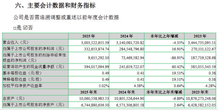 财报数据骄气,公司2025年归母净利润3.33亿元,同比增长16.91%,但非平凡性损益高达3.23亿元,占归母净利润比例达97%,较2024年同比增长53.04%。剔除非平凡性损益后,扣非归母净利润仅961万元,同比下滑86.91%,这一数据径直反应出公司服装主业的试验盈利水平已近乎穷乏。