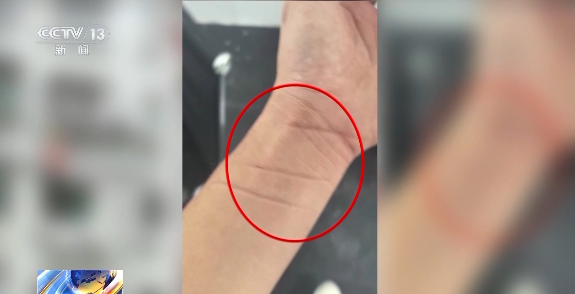 因长时间用力抓握窗沿,黄飞的左手手腕被勒出了三道清晰的红痕。