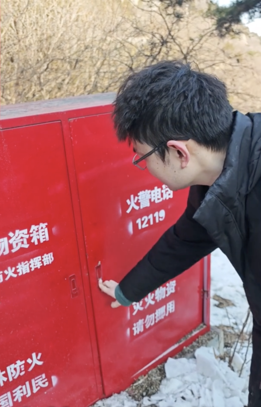 在香山周围的山林,有一处编号为24号的应急灭火物资箱。该物资箱有两扇独立的门,都是按键开合式的,其中一扇门按下按键就可以打开,里面摆放着近20个灭火器;另一扇门无论记者怎么尝试都没能打开。仔细观察发现,箱门用来固定的螺丝断裂,箱门还出现了凹陷错位。裸露出来的空间覆盖了厚厚一层枯枝落叶,导致箱门无法打开,里面的物资情况不明。
