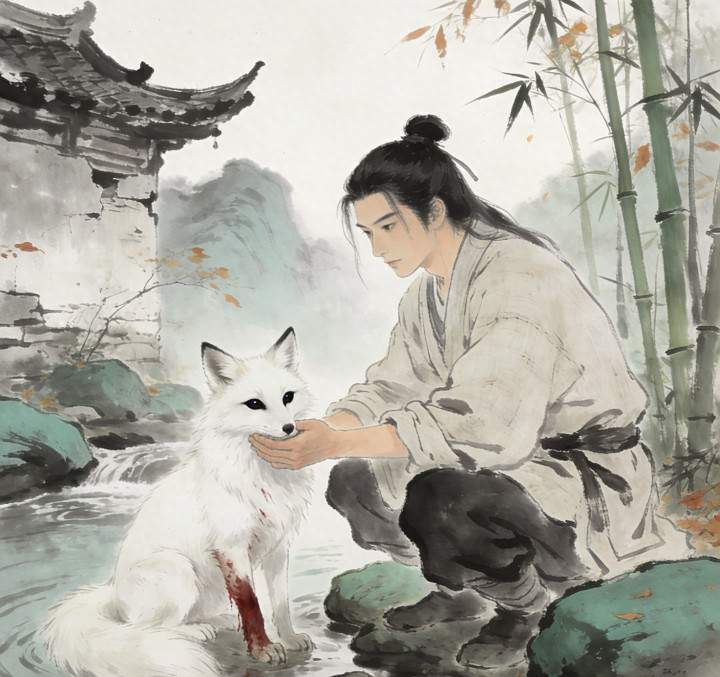 那年深秋,我在山涧边捡到一只受伤的白狐。它后腿鲜血淋漓,却不愿嘶叫,只一对黑琉璃似的眼睛,逍纵眺着我。我心一软,把它抱回僧房,逐日换药喂食,夜里念书,它便蜷在脚边,暖得像一团小蟾光。
