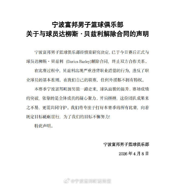 4月8日,宁波队以97比119输给了上海队。在该场比赛中,宁波队外助贝兹利在一次荒唐后与队友发生了浓烈的争持与曲直。宁波队在当晚发布声明中称,球队将与贝兹利拔除责任条约。宁波队这样的作念法被外界点赞。