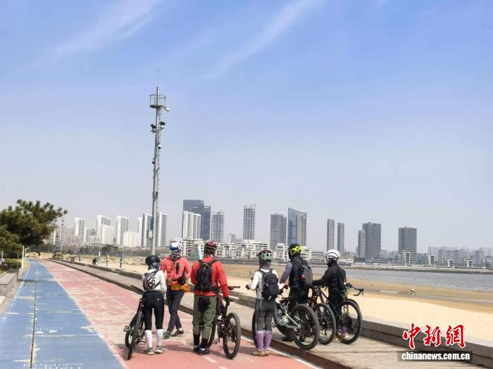 韩国游客以骑行的神志游览青岛沿海形状。受访者供图