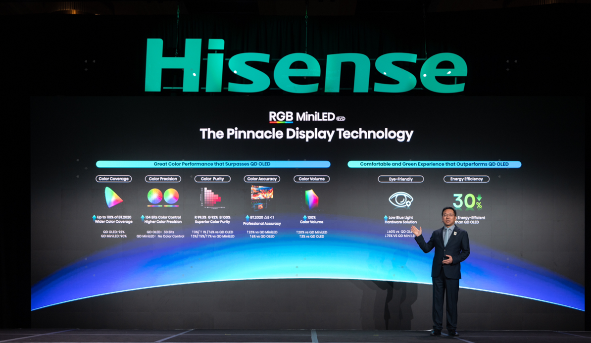 为了打破传统Mini LED和OLED的色彩、能耗及视觉舒适局限,进一步提升大屏时代显示设备的用户体验,海信一年前开创并在全球最先量产了RGB-Mini LED电视,这一创新技术随着全球TOP5电视品牌悉数布局,迅速成为全球高端电视的趋势热词。