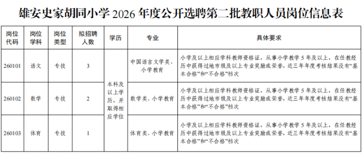 雄安史家巷子小学2026年度公开选聘第二批教职东说念主员公告
