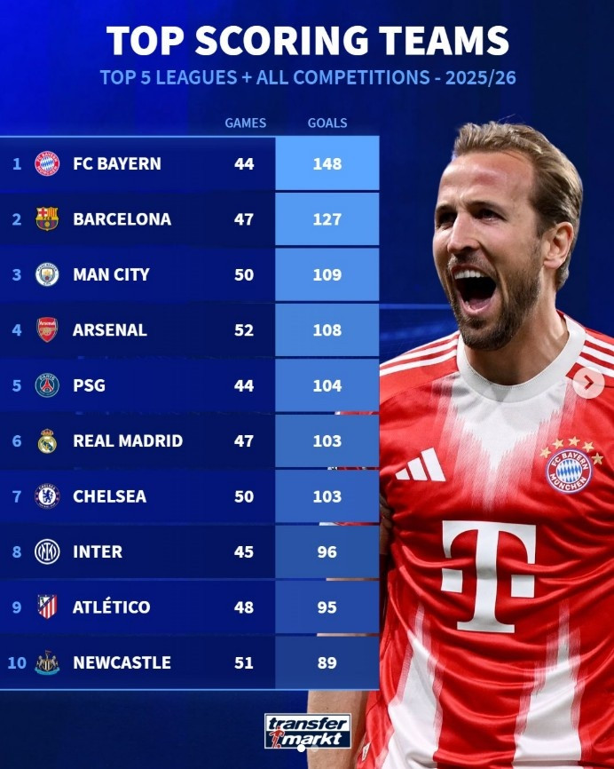 直播吧4月8日讯在欧冠淘汰赛首回合,拜仁2-1打败皇马。德转清点了本赛季现在五大联赛球队在各项赛事总进球榜,开云其中拜仁遥遥跳跃,具体如下: