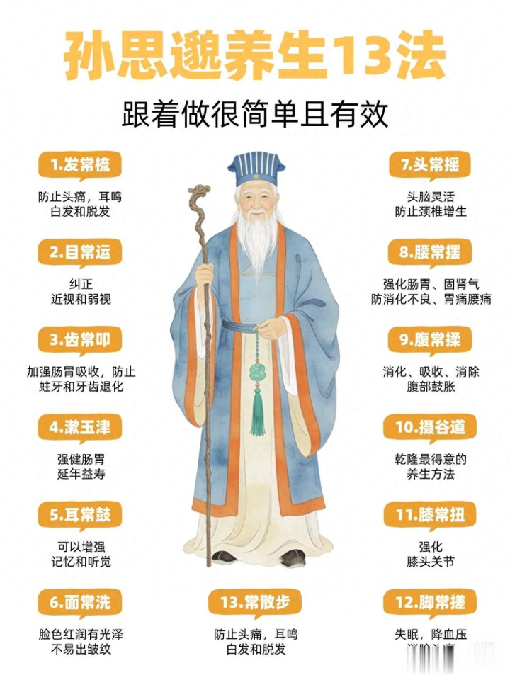孙想邈是唐代著名医药学家,被后东说念主敬称为“药王”,他一世着重养生,享年141岁,在古代可谓遐龄。他转头的养生13法,是聚合本身实施和中医表面得出的精华,涵盖头部、五官、动作、脏腑等全身部位,从内到外珍视,顺应各个年齿段的东说念主,尤其顺应永恒伏案职责、作息不规矩的东说念主群。底下就为公共详备拆解这13法,每一招齐有具体作念法和功效,看完就能上手。